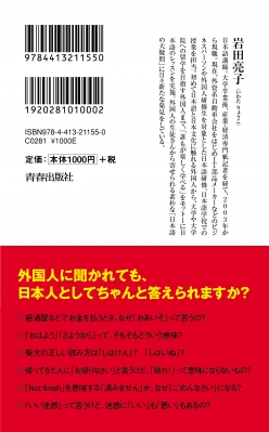 岩田亮子 : 日本語講師。大学卒業後、産業・経済専門紙記者を経て、2003年から現職。現在、外資系自動車会社をはじめIT部品メーカーなどのビジネスパーソンや外国人研修生を対象とした日本語研修、日本語学校での授業を担当。初めて日本語と日本文化に触れる外国人から、大学や大学院への留学を目指す外国人まで、「誰もが楽しく学べる」をモットーに日本語のレッスンを実施。外国人の生徒さんから寄せられる素朴な「日本語の大疑問」に日々新たな発見をしている(本データはこの書籍が刊行された当時に掲載されていたものです)