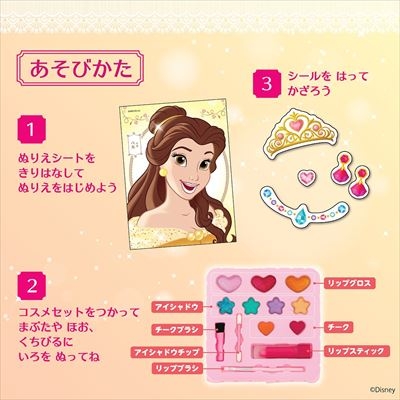 女の子の憧れのメイクセットのような画材で、ぬりえシートに描かれたディズニープリンセスをかわいくメイクアップしよう!(※顔には塗れません)
