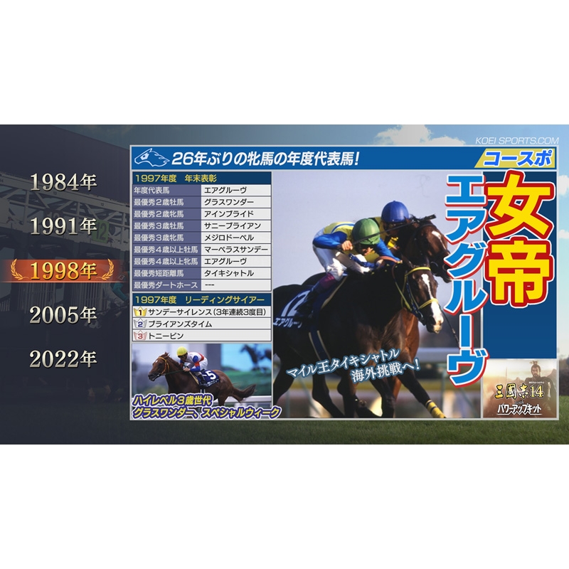 また、3歳女王「デアリングタクト」や白毛の芝重賞馬「ソダシ」を始め、現2歳世代までの400頭以上の史実馬を追加するなど、2021年の最新競馬データにいち早く対応します。
