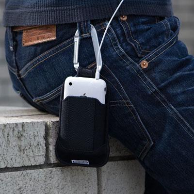 カラビナ付きキャリングケースです。iPodを始めとするMP3プレイヤーのほか、iPhoneなどの携帯電話やイヤホン、